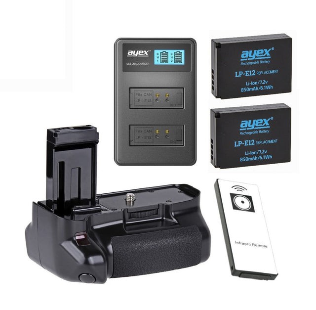 ayex Batteriegriff für Canon EOS 100D, SL1 wie BG-100DH + IR-Fernauslöser + 2x LP-E12 Akku + 1x USB Dual Ladegerät