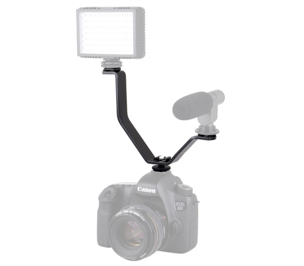 Mit dieser großen Blitzschiene können Sie Zubehör in unterschiedlichen Höhen an Ihrer Kamera bzw. Ihrem Stativ montieren und so Ihre Aufnahmen optimieren. Bis zu drei Zubehörteile gleichzeitig finden auf der Schiene Platz. Jegliches Equipment, das über einen Standard-Blitzschuh verfügt, lässt sich an den drei Anschlüssen anbringen, wie z. B. Blitzgeräte, Videoleuchten oder Mikrofone.