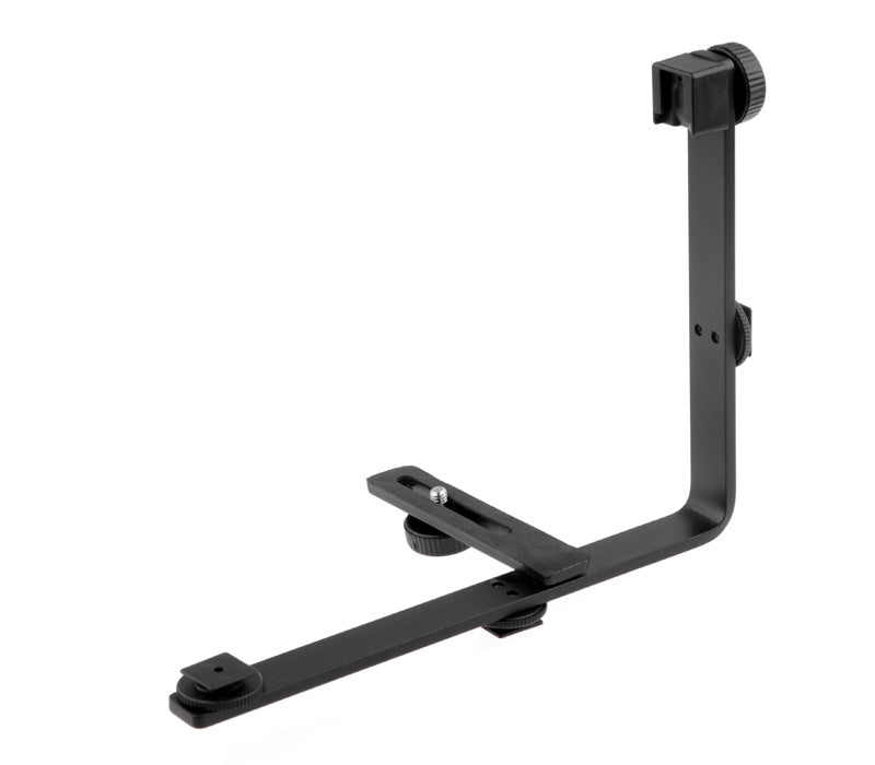 Die Flächenleuchten werden hierzu einfach auf die Blitzsockel der Schiene geschoben und mit den Feststellrädchen arretiert. Die Kamera wird auf der Kameraschraube mit Standardgewinde montiert und kann auf der gummierten rutschsicheren Schiene um ca. 6cm verschoben werden.