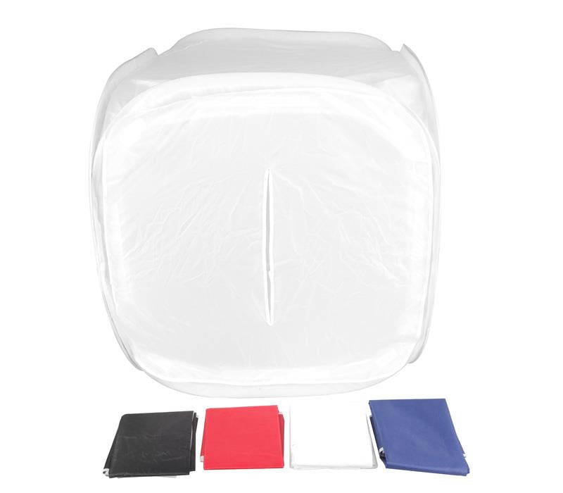 Mit vier zugehörigen Hintergrundtüchern in schwarz, weiß, rot und blau können Hintergrund und Boden abgedeckt werden. Sie lassen sich mit Klettbändern fixieren. Die abnehmbare Frontabdeckung verfügt über einen Schlitz für das Kameraobjektiv und wird mit ebenfalls mit Klettbändern befestigt.
