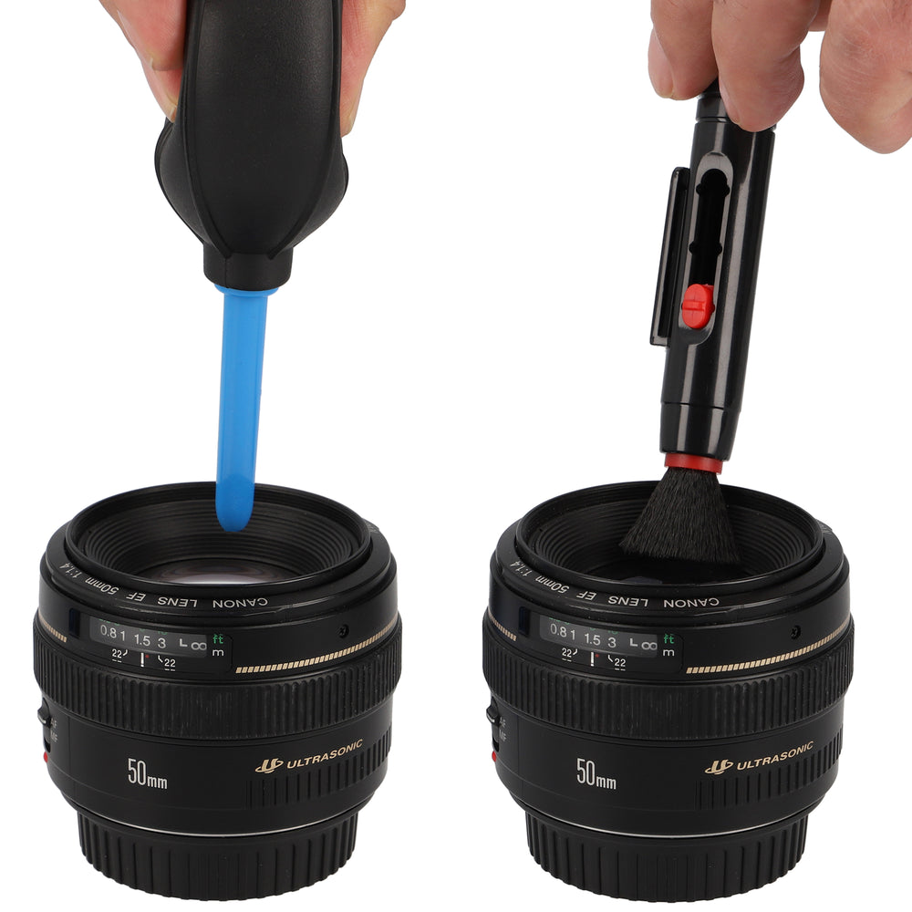 1) Abpusten: Mit dem Blasebalg Staub von Linse, Sucher und Display entfernen (bei Sensoren nur kontaktlos pusten).