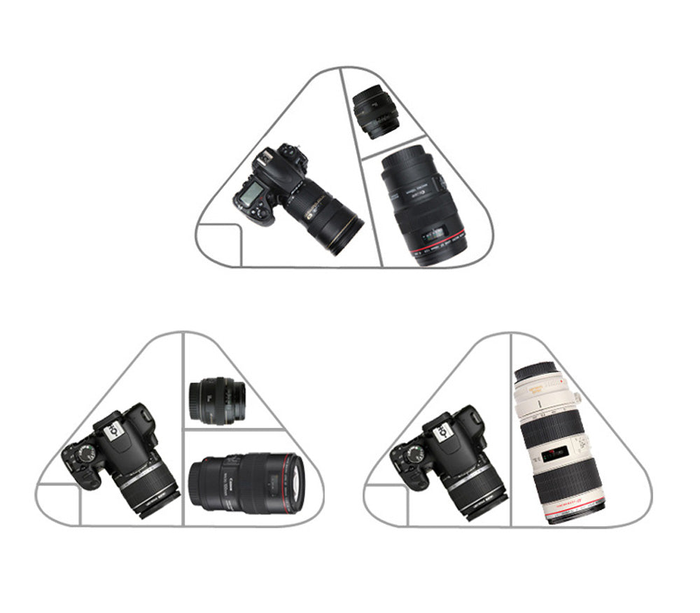 In der Triangel Slingbag ist Ihr Fotoequipment nicht nur sicher aufgehoben, sondern dank der praktischen Form immer schnell griffbereit.Im dreieckigen Hauptfach, das sich von zwei Seiten per Reißverschlussklappen öffnen lässt, befinden sich Polsterungen mit Klettband. Diese können Sie individuell versetzen und Ihre Kamera samt Zubehör wie Objektiv und Blitzgerät optimal verstauen. Die Doppel-Reißverschlussfächer lassen sich zusätzlich durch stabile Clips sichern. Kleine Dinge wie Speicherkarten und Akkus können in zwei Innentaschen mit Klettverschluss aufbewahrt werden und Filter, Putztuch, Handy, Stifte, etc. im Vorderfach. Aufgrund der leuchtenden Innenfarbe lässt sich alles bestens finden.