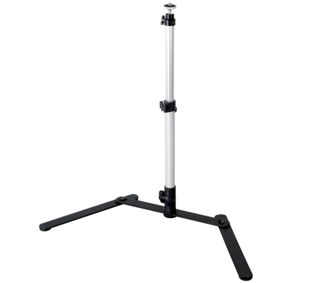 Auf diesem Tisch-Stativ können Sie Blitzgeräte und Videoleuchten montieren und individuell ausrichten. Das Stativ lässt sich neigen und im gewünschten Winkel arretieren.Durch die Verzahnung im Gelenk ist sicherer Halt gegeben. Der dreiteilige verstellbare Fuß sorgt dafür, dass das Stativ nicht kippt.