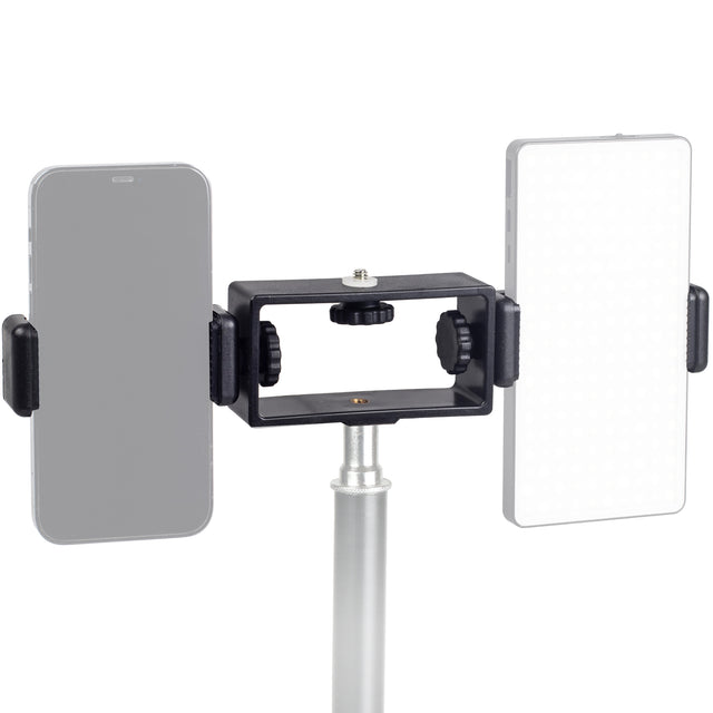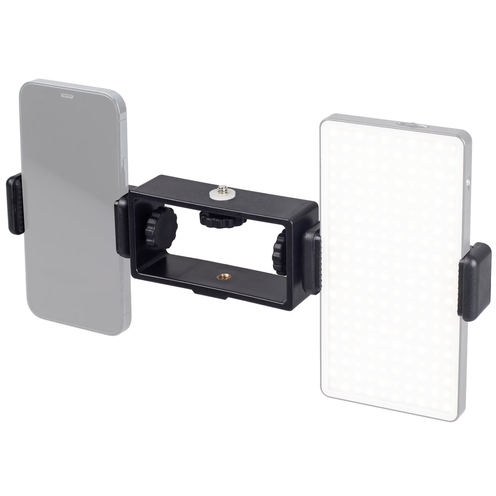 Mit dieser Dual- Smartphone-Halterung können Sie ganz einfach zwei Smartphones auf einem Stativ oder Kamera-Blitzschuh nutzen. Die Halterung besteht aus einem flexiblem Montagerahmen auf dem zwei mitgelieferte Klemmen aufgeschraubt werden können, wahlweise für horizontalen oder vertikalen Betrieb z.B. Breitbild oder Hochkantvideos).