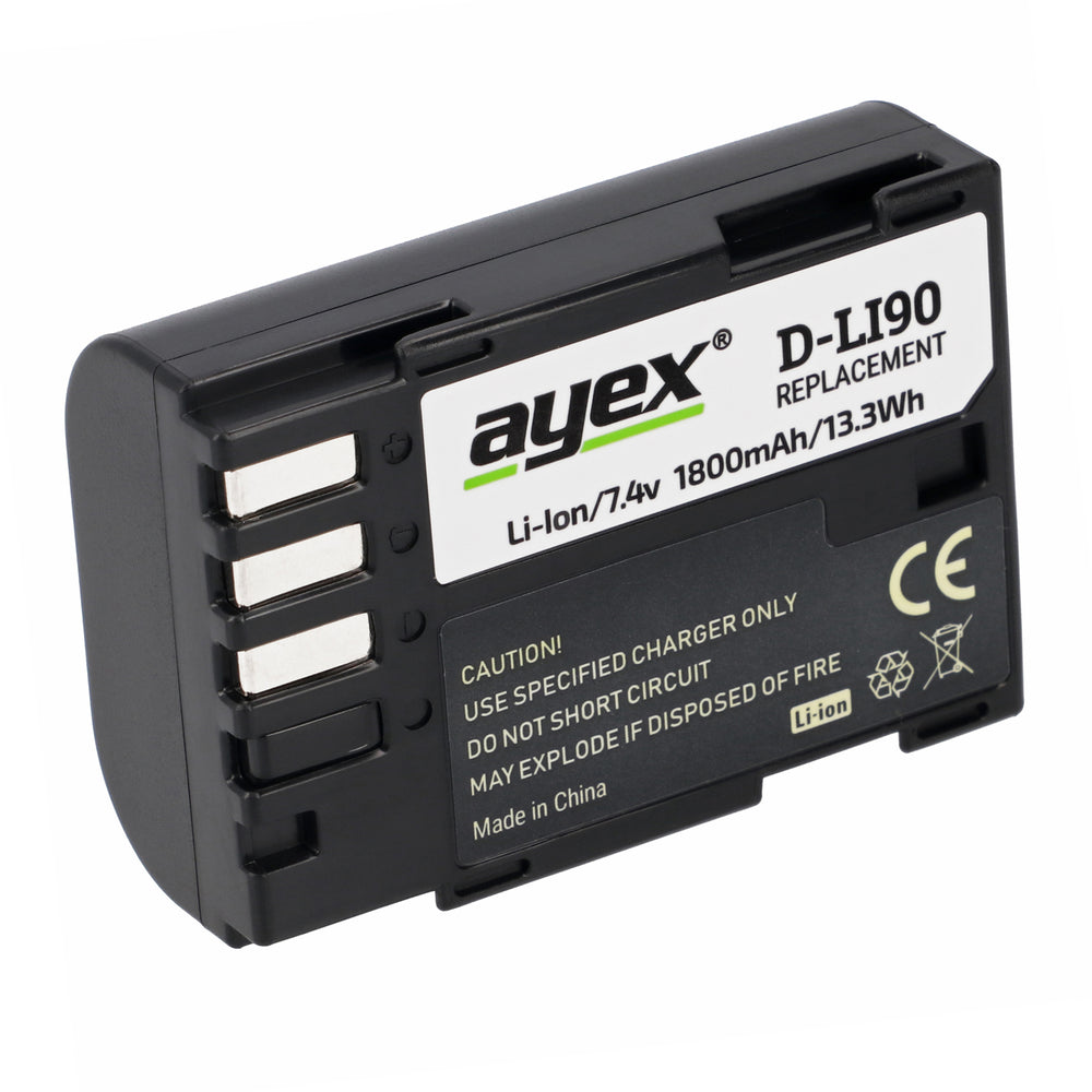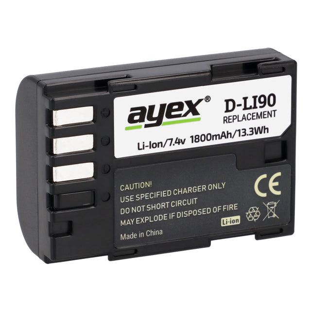 Der ayex D-Li90 Akku verfügt über umfassende Sicherheitsmerkmale wie Schutz vor Kurzschluss, Überladung und Überhitzung. Diese Funktionen sorgen für einen sicheren Betrieb und tragen zur Langlebigkeit Ihrer Kamera und des Akkus bei.