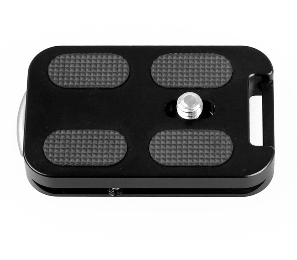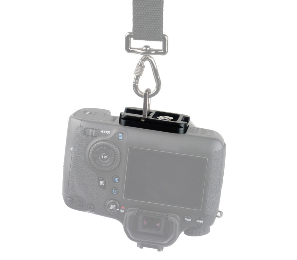 Diese Zusatzplatte ist kompatibel mit allen Arca-Swiss Standard-Schnellwechselplatten und für praktisch alle DSLR-Kameras geeignet. Auf der Rückseite befindet sich eine aufklappbare sehr stabile Öse. Hieran lässt sich ein Kameragurt mit Karabiner befestigen. Durch die seitliche Aussparung kann eine Handschlaufe gezogen werden.