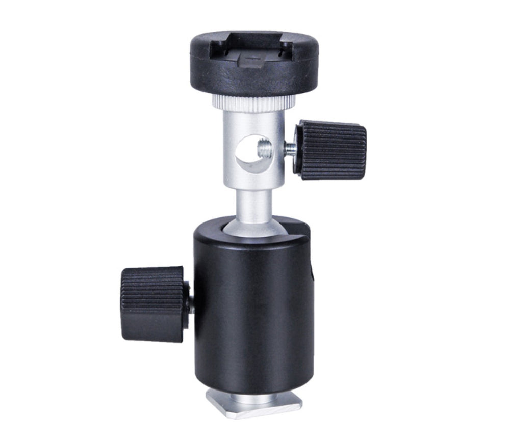Mit dem zugehörigen Adapter kann alternativ zu einem Blitz auch Zubehör mit 3/8" Gewinde angebracht werden. Der Adapter kann auch in die Unterseite der Halterung geschraubt werden und mit seinem Innengewinde auf 1/4" Stativanschlüssen befestigt werden. Nimmt man den Blitzschuh ab, lässt sich auf der darunter sitzenden Schraube Zubehör mit 1/4" Anschluss montieren.
