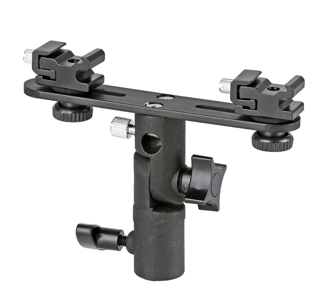 Die stabile Halterung ermöglicht es Ihnen, zwei Geräte nebeneinander (wie z. B. Blitz und Mikrofon) plus einen Reflexschirm auf einem Stativ zu befestigen und individuell auszurichten.