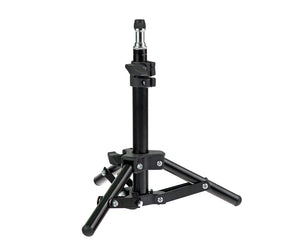 Dieses handliche Lampenstativ ermöglicht aufgrund seiner niedrigen Höhe die Ausleuchtung Ihrer Aufnahmen von unten. Ebenso kann es als Tischstativ zum Einsatz kommen. Es lässt sich von 26 bis 40cm stufenlos verstellen und per Flügelschraube arretieren.Sowohl kleinere Lampen als auch Blitze und Kompaktblitze bis 2,5 kg können auf dem Stativ montiert werden. Hierfür sind ein 1/4" Standardgewinde und ein 5/8" Spigot vorhanden.