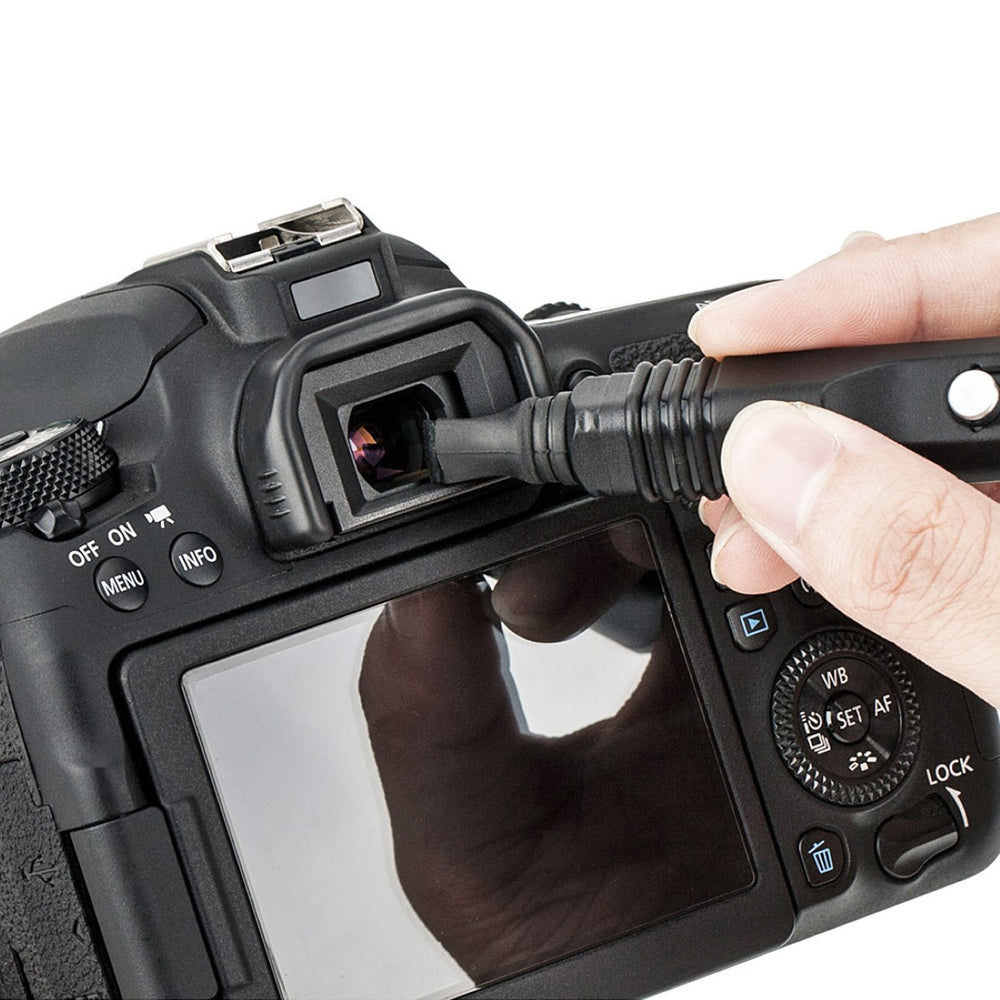 Das andere Ende des Stifts verfügt über eine intelligent gestaltete, doppelte Kohlenstoff Carbonspitze mit einer runden und einer dreieckigen Reinigungsfläche. Das runde Ende eignet sich für die Reinigung von runden optischen Bildschirmen, während das dreieckige Ende für die Reinigung von Ecken des Suchers oder Bildschirms ideal ist.