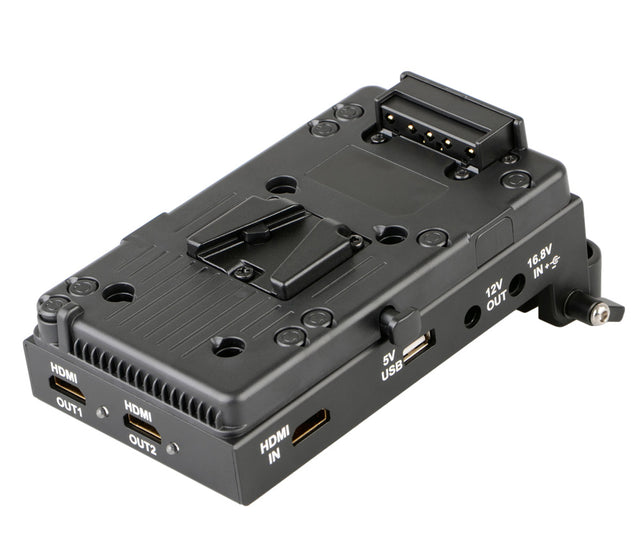 Diese V-Mount Platte bietet zahlreiche Anschlüsse mit unterschiedlichen Spannungen. Mit nur einem V-Mount-Akku lassen sich daher mehrere Geräte gleichzeitig mit Strom versorgen, wie z. B. Kamera, Monitor, Mikrofon, Videolampe usw. Zusätzlich ist ein HDMI-Splitter vorhanden und für Geräte mit höherer Spannung eine Powertap-Buchse.