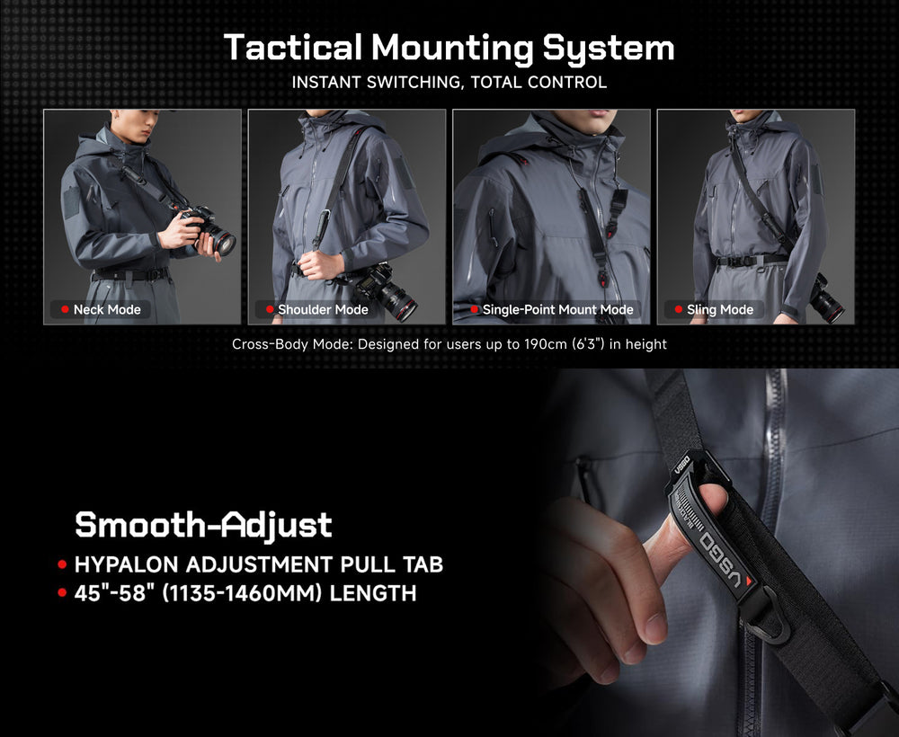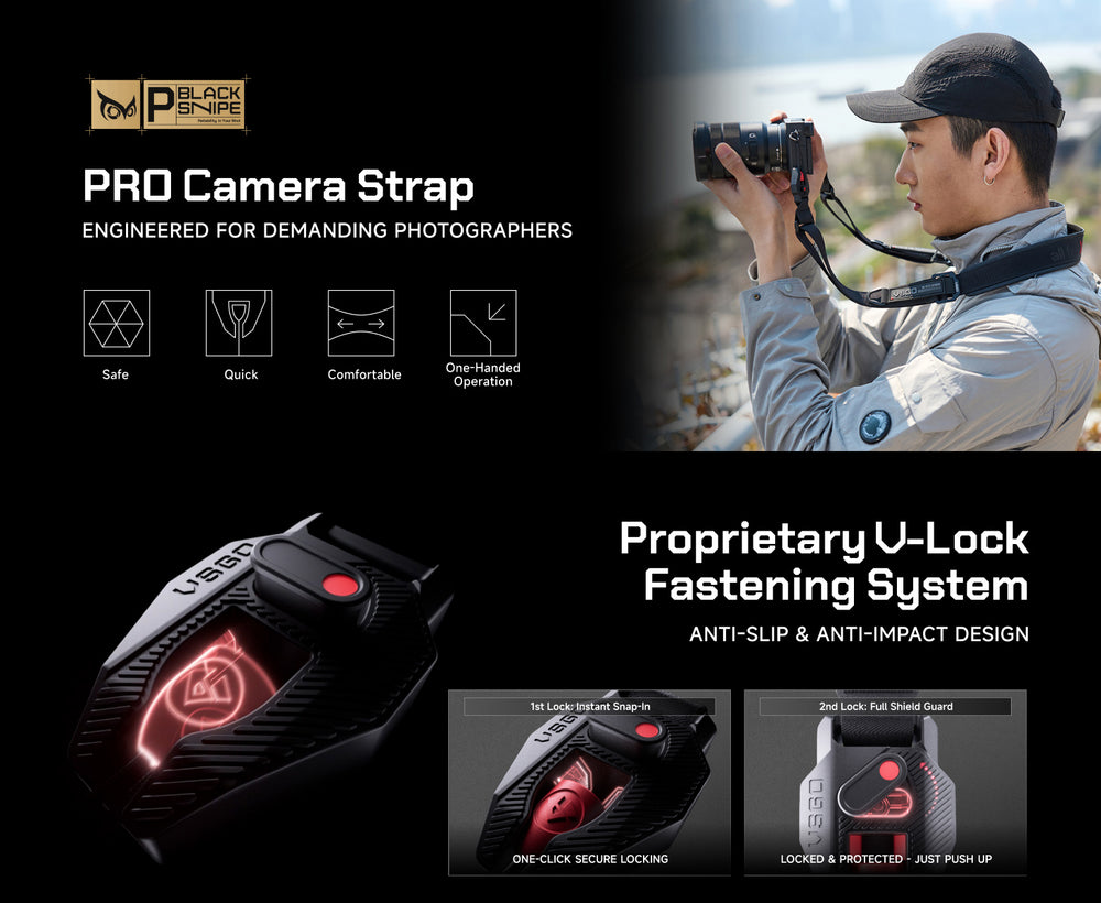 Der VSGO Black Snipe Pro Kameragurt ist das Ergebnis modernster Ingenieurskunst für Fotografen, die in jeder Situation sicher und flexibel arbeiten möchten. Mit seinem exklusiven V-Lock-Verschlusssystem und der robusten, doppellagigen Nylonstruktur bietet er unvergleichliche Stabilität, Komfort und Kontrolle. Dank des durchdachten Designs lässt sich die Kamera mit einer Hand sichern oder lösen – ideal für dynamische Aufnahmen, Reisen oder Events.